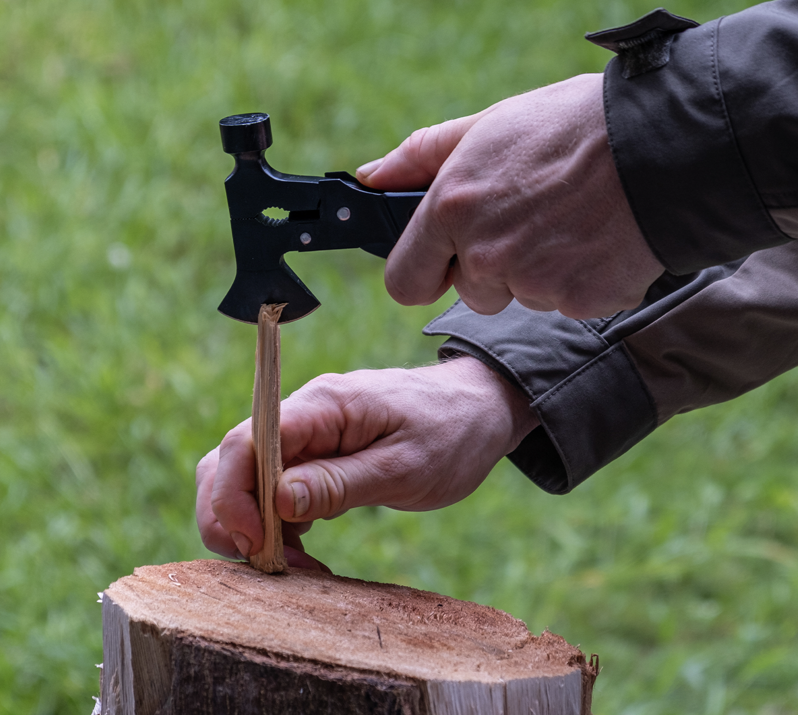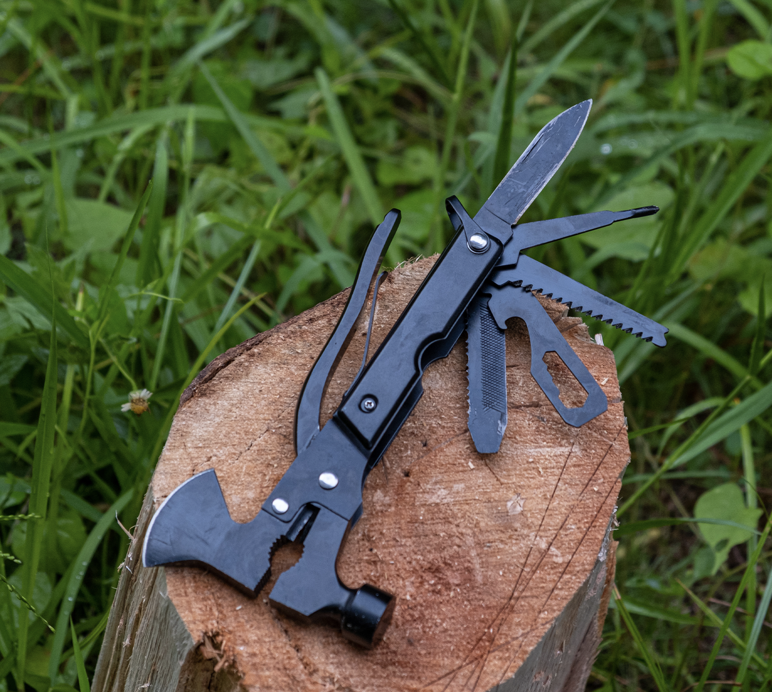 This 14-in-1 combo gadget includes a serrated knife, screwdriver, flat screwdriver, saw, file, bottle opener, 4 hex wrenches, pliers, rasper, wire cutters, axe, and hammer. It works well during camping, exploring, fishing, field training, and long-distance travel.